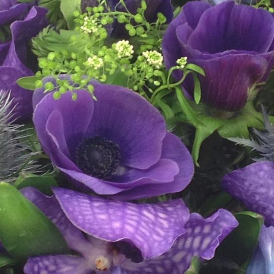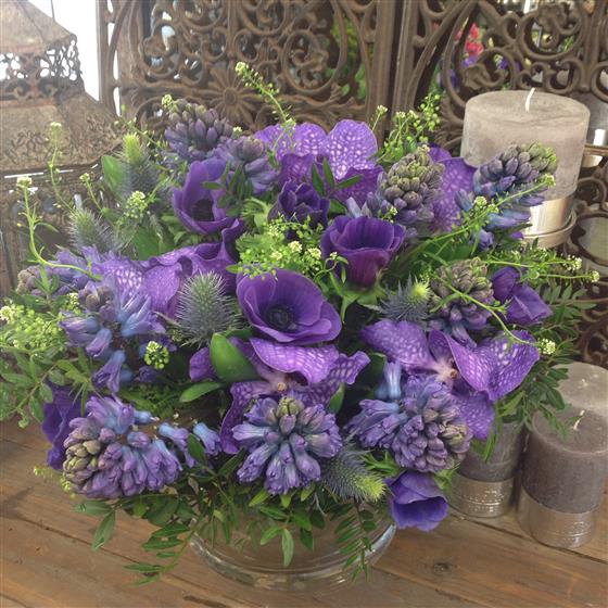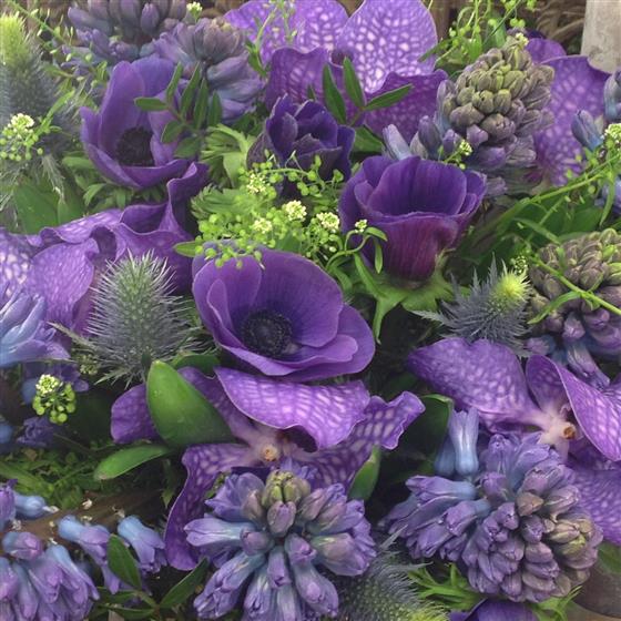 Blue hyacinths with blue vanda orchid heads and blue anemones.