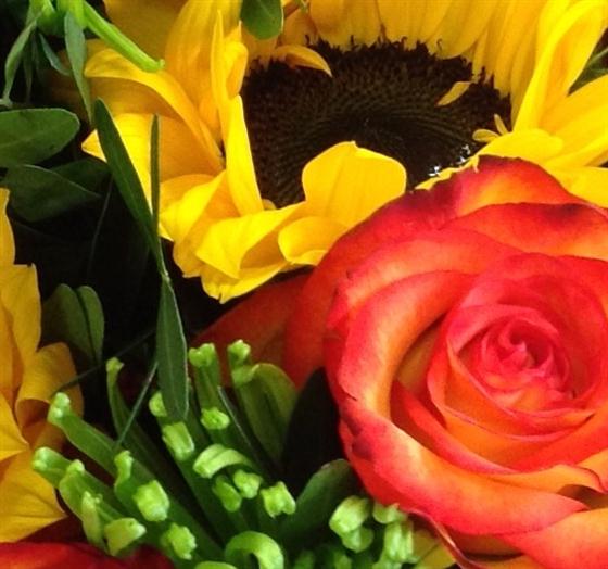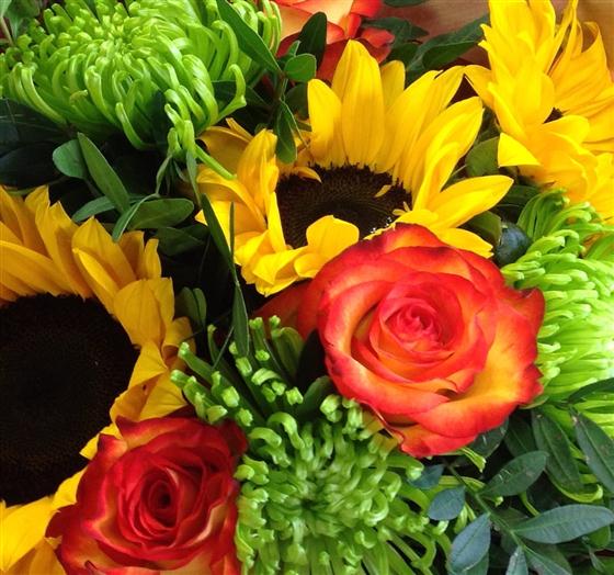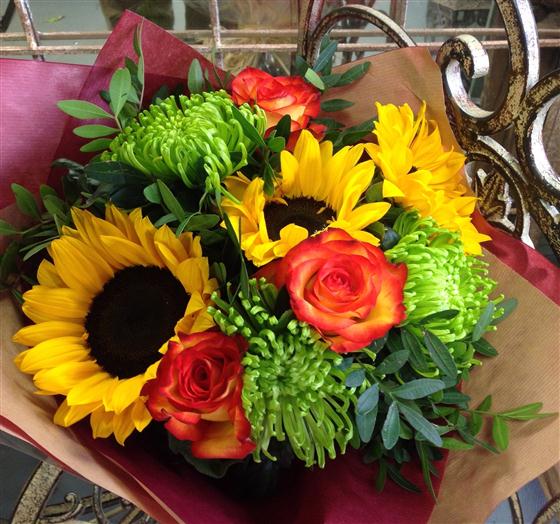 Sunflowers, roses and green blooms are the features in this striking bouquet