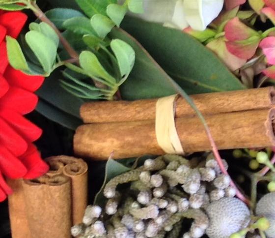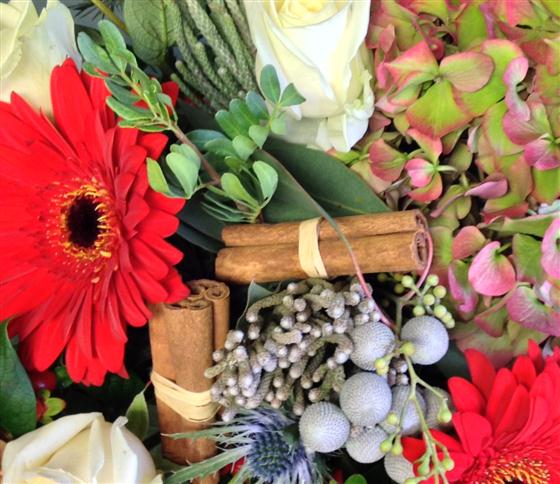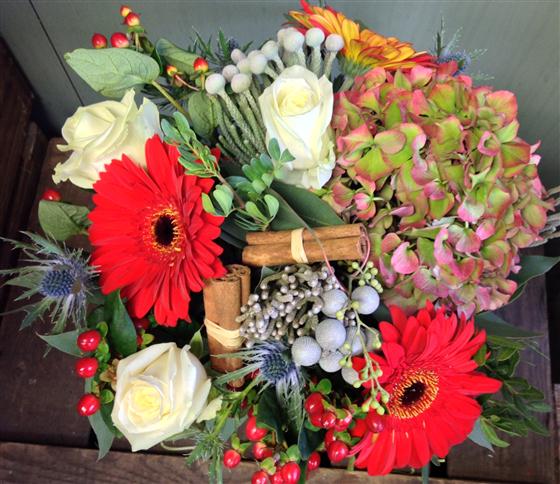 For a classy Christmas gift chose these vintage hydrangeas, silver brunia, white roses and red gerberas mixed with cinnamon and hypericum berries.
